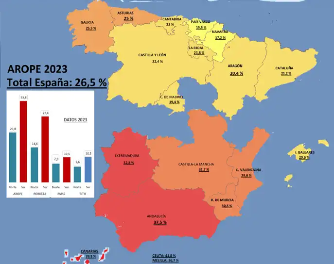 Existe una notable asimetría entre las regiones del norte y el sur de España en cuanto a la pobreza y la exclusión social (AROPE), según el informe “El Estado de la Pobreza. Pobreza y Territorio. Comunidades autónomas y Europa”, elaborado por la Red Europea de Lucha contra la Pobreza y la Exclusión Social en el Estado Español (EAPN-ES). De hecho, afirma que “el territorio es una significativa fuente de desigualdad y la cohesión territorial”.