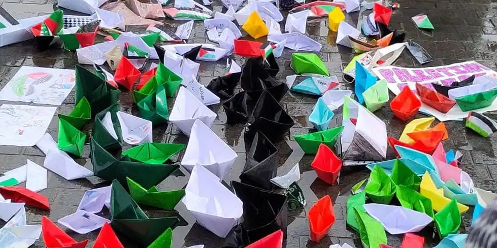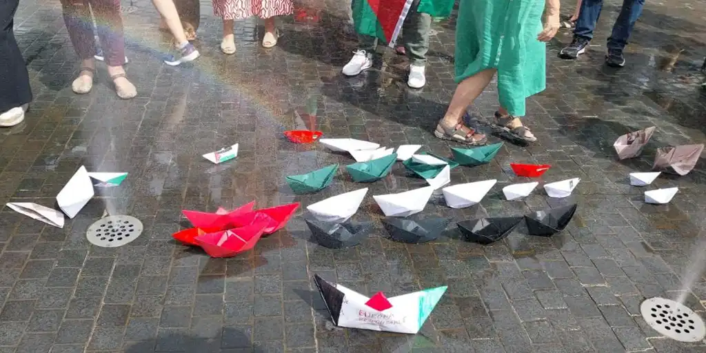 El acceso a la zona, incluido los puentes sobre el río, quedaron pronto abarrotados por personas que trataban de llegar a la zona de las fuentes donde se colocaron las pancartas alusivas y se arrojaron barquitos de papel con lemas como “Palestina Libre”, “Paz para para Palestina” o “Stop Genocidio”.