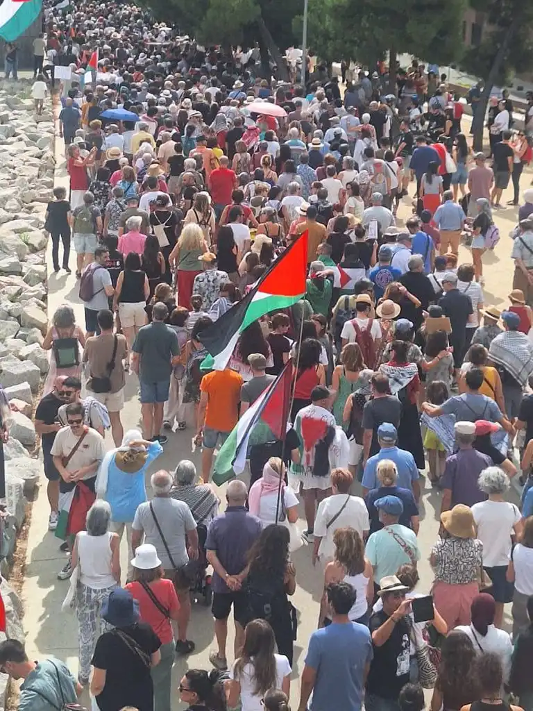 Además de la movilización en el muelle de la Madera del puerto de Barcelona, se celebraron concentraciones y gestos en medio centenar de localidades en apoyo a las tripulaciones que esperan llegar a las aguas israelíes a mediados de septiembre.