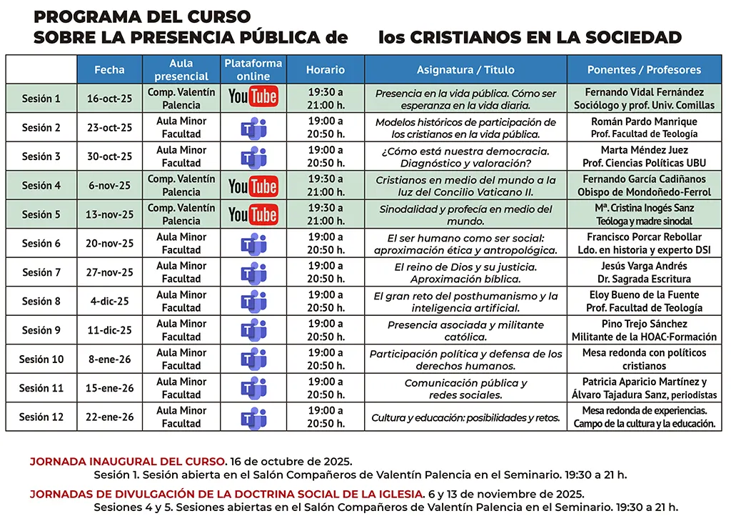 Del 16 de octubre de 2025 al 20 de enero de 2026 se celebrará un Curso de presencia en la vida pública, que organiza desde la Cátedra Francisco de Vitoria de la Facultad y la Delegación diocesana para la Pastoral del Trabajo. Inscripciones hasta el 19 de octubre, aquí