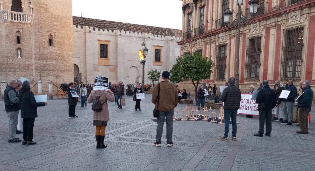 En un ambiente de silencio y de simbolismo, la concentración de este jueves en la plaza Virgen de los Reyes, frente a la Catedral de Sevilla, convocada por la Hermandad Obrera de Acción Católica (HOAC) y la Pastoral del Trabajo, a la que también asistió la Asociación de Víctimas de Accidentes y Enfermedades Laborales de Andalucía (AVAELA, abrió con la canción de la campaña Cuidar el trabajo, cuidar la vida, para subrayar el mensaje central del acto: la vida y la dignidad humana es sagrada, y protegerla en los tajos y centros de trabajo es una exigencia ética y social.