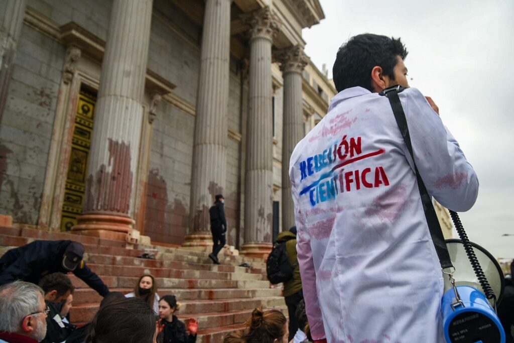La segunda acción que me llevará más adelante ante otro juez o jueza tuvo lugar el 6 de abril de 2022, durante una semana de movilizaciones internacionales impulsadas por Rebelión Científica, surgida de Extinction Rebellion. En Madrid participamos un centenar de personas de varios colectivos, como Ecologistas en Acción –donde desarrollo mi militancia principal–. La protesta consistió en acercarnos sin ser detectados al Congreso de los Diputados y verter un líquido biodegradable de color rojizo, fácil de limpiar, en sus escaleras. La policía nos retiró al poco tiempo y se produjeron identificaciones que derivaron en la detención de 15 personas. En un principio se nos acusó de haber paralizado la actividad parlamentaria, lo que abría la puerta a una causa de carácter “antiterrorista” ante la Audiencia Nacional. Finalmente, esas acusaciones decayeron –incluida la de resistencia a la autoridad– y quedó sólo en firme la de daños al patrimonio histórico, por la que la Fiscalía de Madrid pide 21 meses de cárcel.