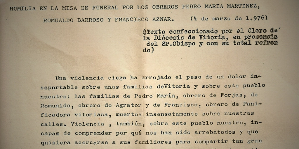 Al día siguiente, en la homilía en la misa de funeral por los obreros Pedro María Martínez, Romualdo Barroso y Francisco Aznar –los otros dos tiroteados morirían días más tarde–, se leyeron unas palabras elaboradas por el clero de la diócesis de Vitoria, “en presencia del Sr. obispo y con su total refrendo”.
