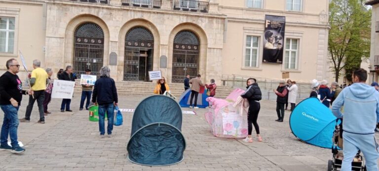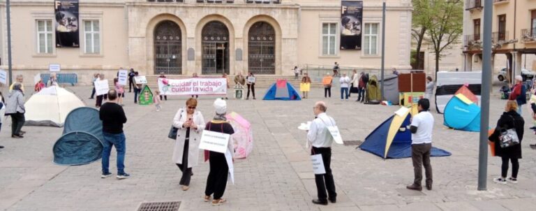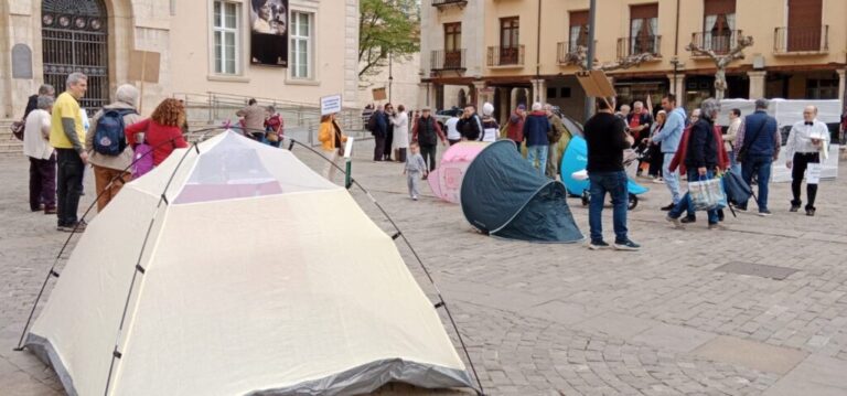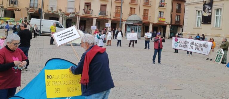 El desarrollo del encuentro tuvo también lugar en la Plaza Mayor de Palencia, donde se realizó un gesto público con el lema “Plántate y actúa”. La escenificación (con tiendas de campaña, carteles y mensajes reivindicativos) puso rostro a distintas realidades de precariedad: vivienda inaccesible, sobrecarga de los cuidados, explotación de trabajadoras del hogar, vulnerabilidad de las personas migradas o siniestralidad laboral.